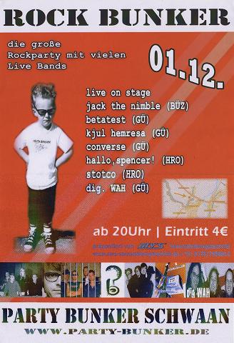 Auswärts! - Nach einer sehr langen Serie von Gigs in Rostock geht es nun erstmals wieder ins weite Land hinaus. Am 01.12. spielen wir im Bunker zu Schwaan. Und an alle Interessierten: Es lohnt sich wirklich, dieses Event in den Terminkalender aufzunehmen, denn es kommen außerdem noch 6 andere Bands aus Mecklenburg zusammen. Darunter sind Kjul Hemresa und Beta Test aus Güstrow, die hervor-